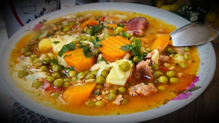 1 кромид, 1 замрзната пиперка, 2 моркови, 500 г грашок, 300 г мелено месо, 1 суво ребро, 1 компир, 1 лажичка сладок пипер, 2 лажици широки тестенини, масло, сув зачин, мелен пипер, листови магдонос.